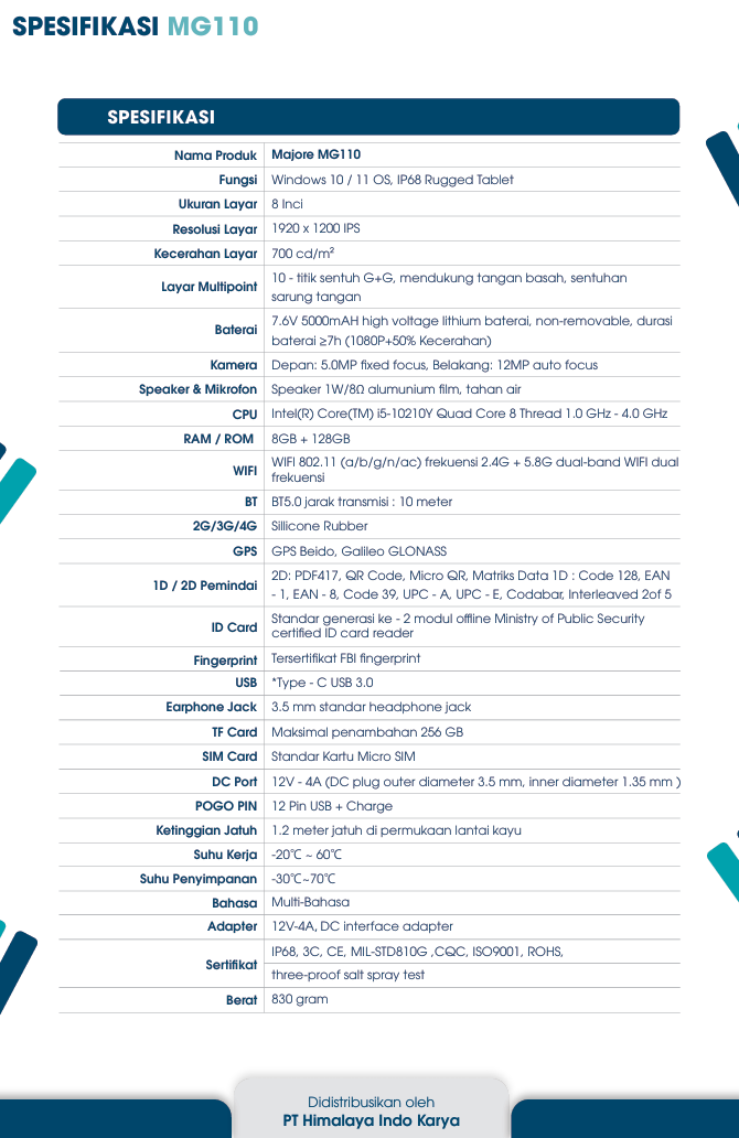Equipped with OS Windows 10/11, memory and storage capacity: 8+128GB for flexibility of use at various levels of projects, various needs biometric authentication. IP68 durability makes it best suited for use such as in banks, telecommunications, schools, hospitals, outdoor, and others. Majore MG110 with 5th Gen Core i10 CPU perfect for running software Windows-based, has a data transmission that efficient and stable.